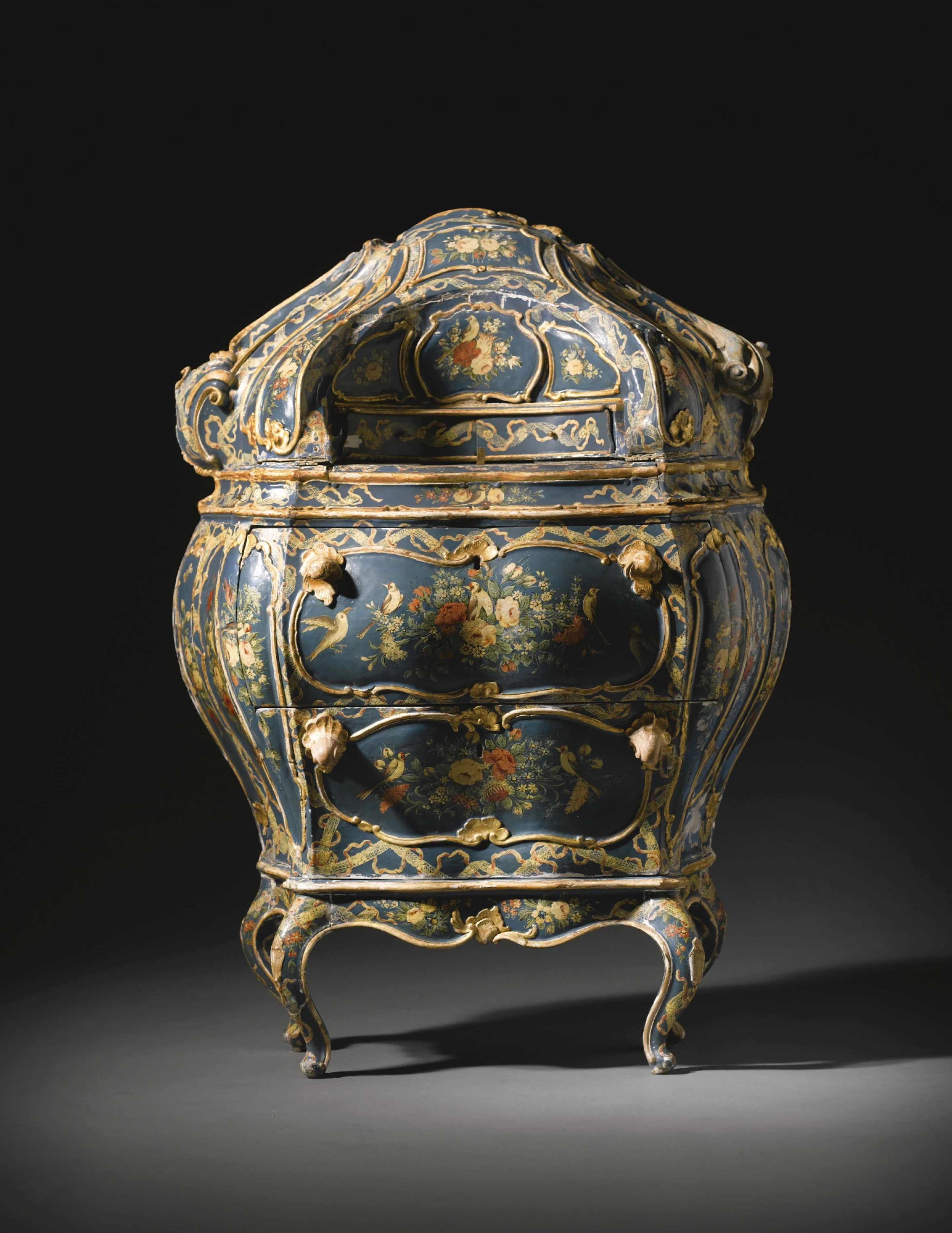An Italian polychrome and blue lacquered, parcel-gilt and 'a merletto' decorated carved bureau, Venetian mid 18th century