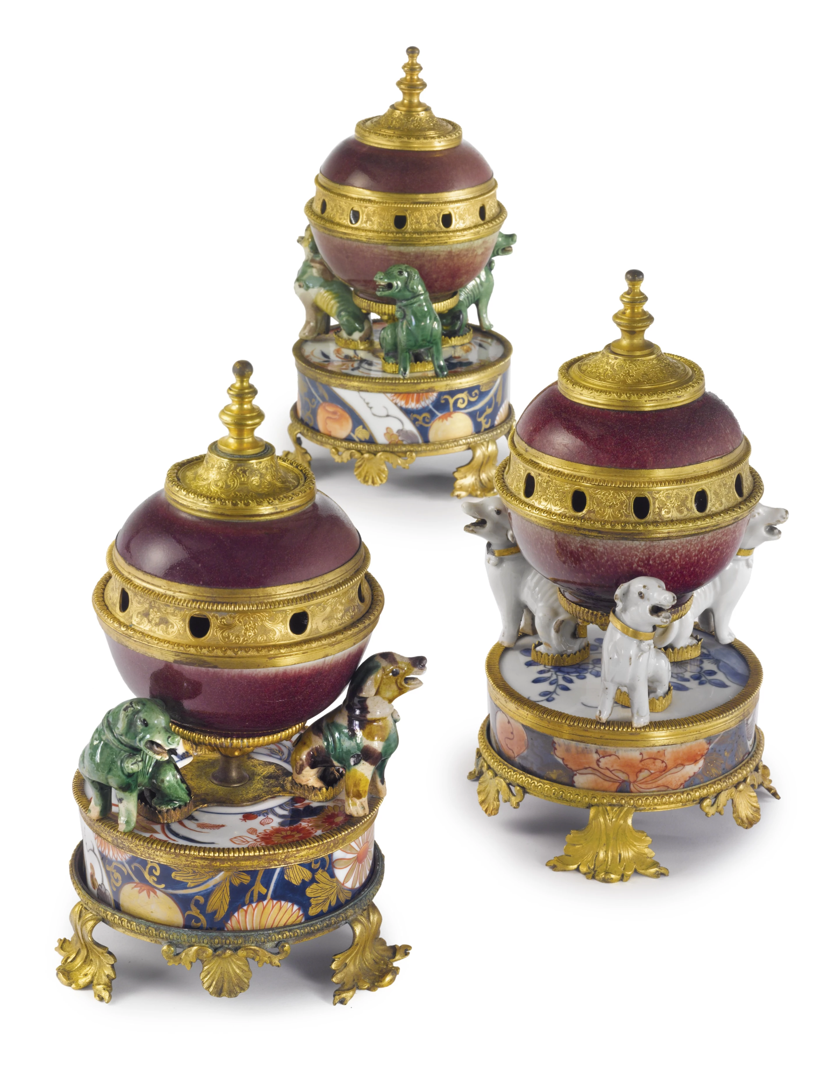 An ASSEMBLED SET OF THREE LOUIS XV ORMOLU-MOUNTED CHINESE AND JAPANESE PORCELAIN 'POT-POURRI' VASES circa 1735, the porcelain 18th century