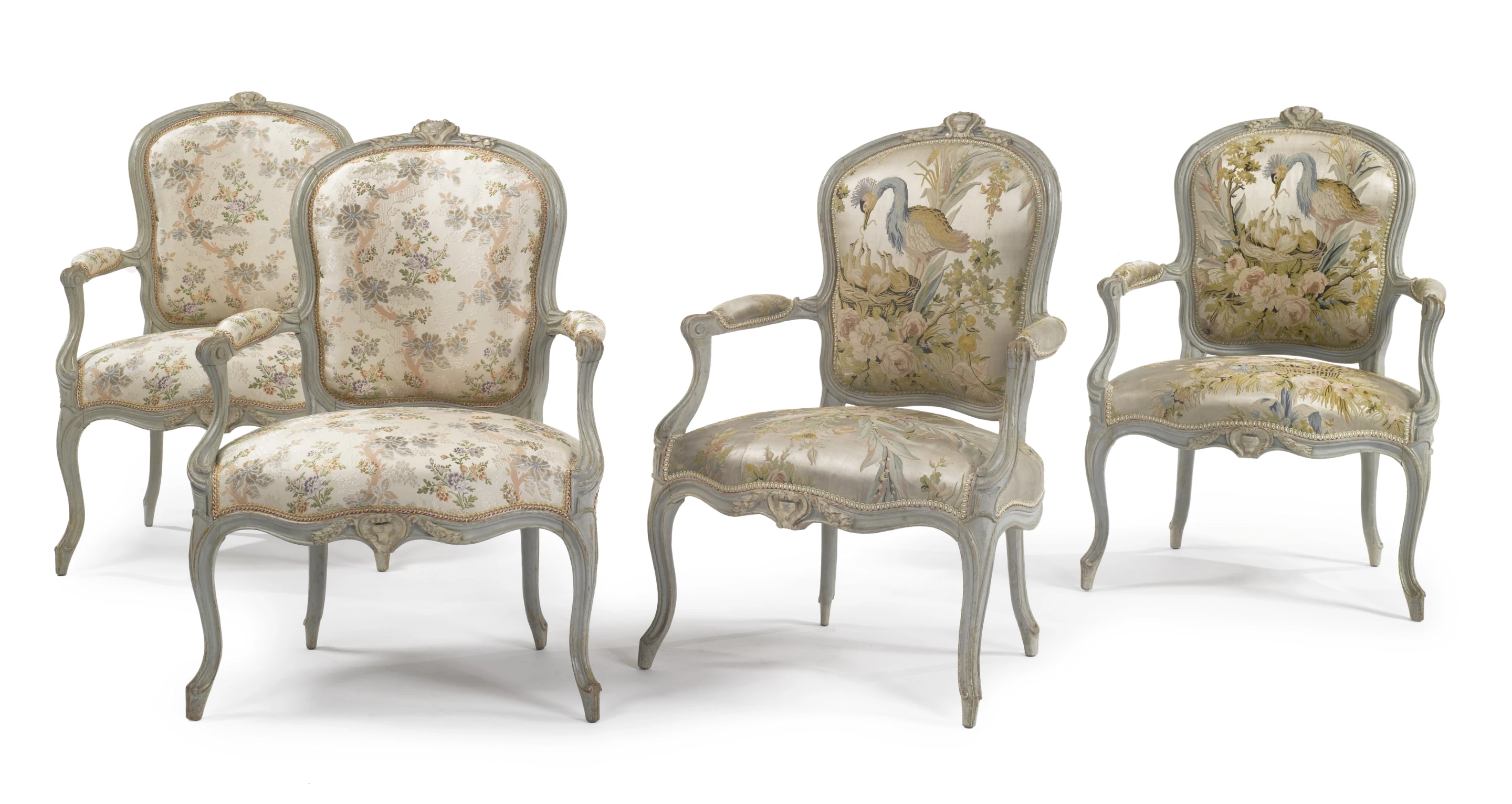 A SET OF FOUR LOUIS XV BLUE AND GREEN-PAINTED AND CARVED FAUTEUILS circa 1750, stamped P. F. Corbisier