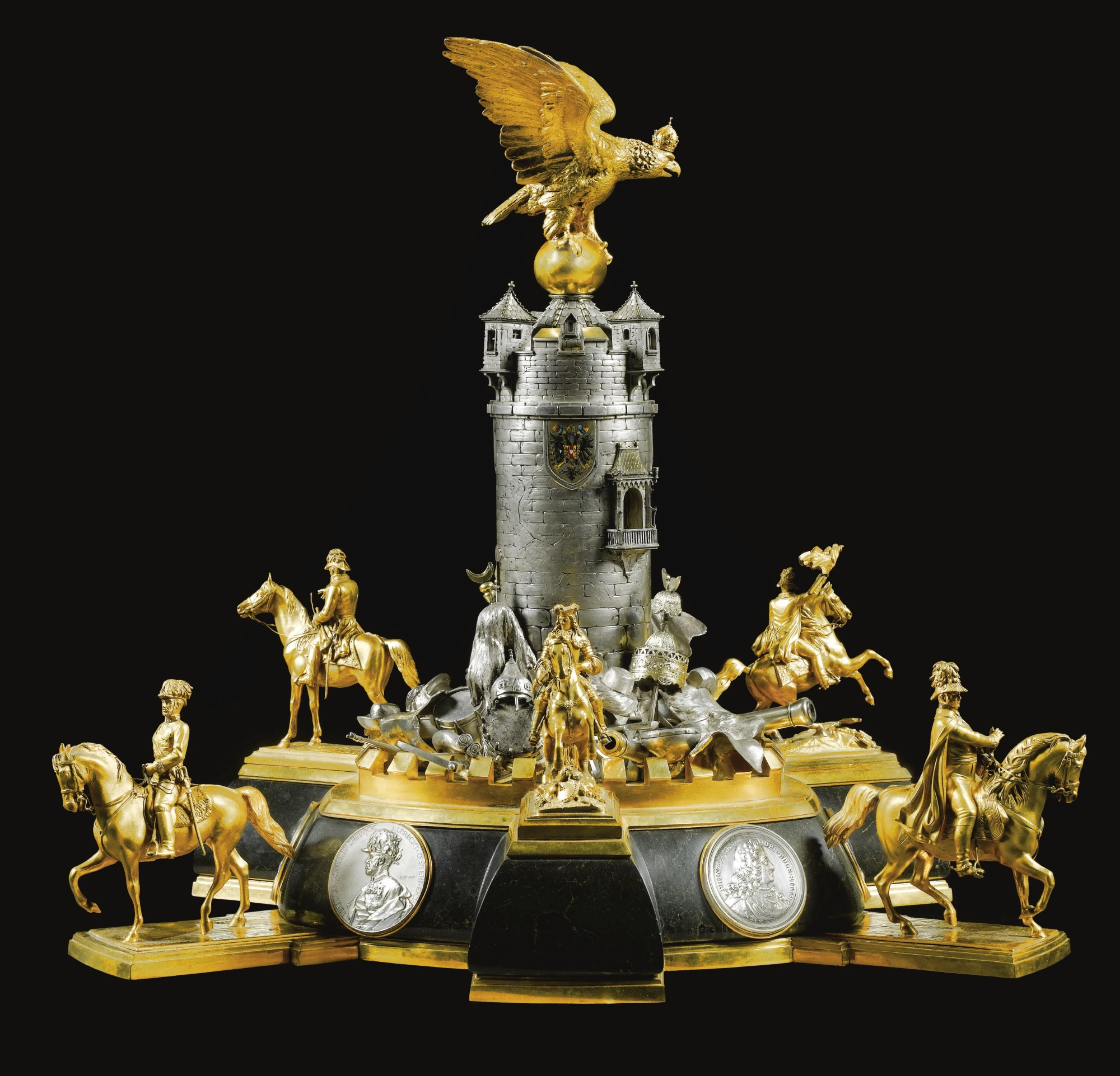 A German gilt bronze, repoussé and enamelled silver, silvered copper and serpentine centrepiece, by Royal Bavarian Court Goldsmith Theodor Heiden, after a design by Caspar von Zumbusch Munich, circa 1900