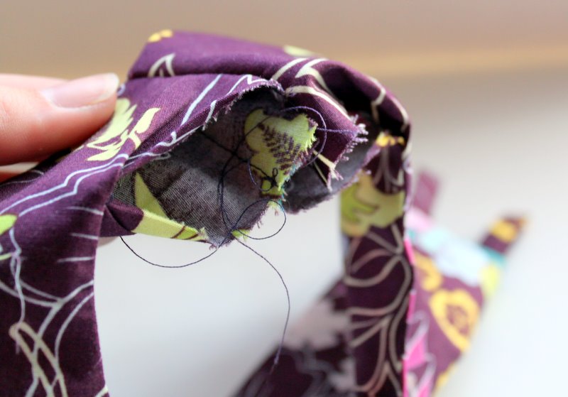 Аккуратно тяните за нити, формируя сборку на юбке. Необходимо, чтобы верхняя часть юбки совпала по длине с низом лифа,а сборка была равномерной.