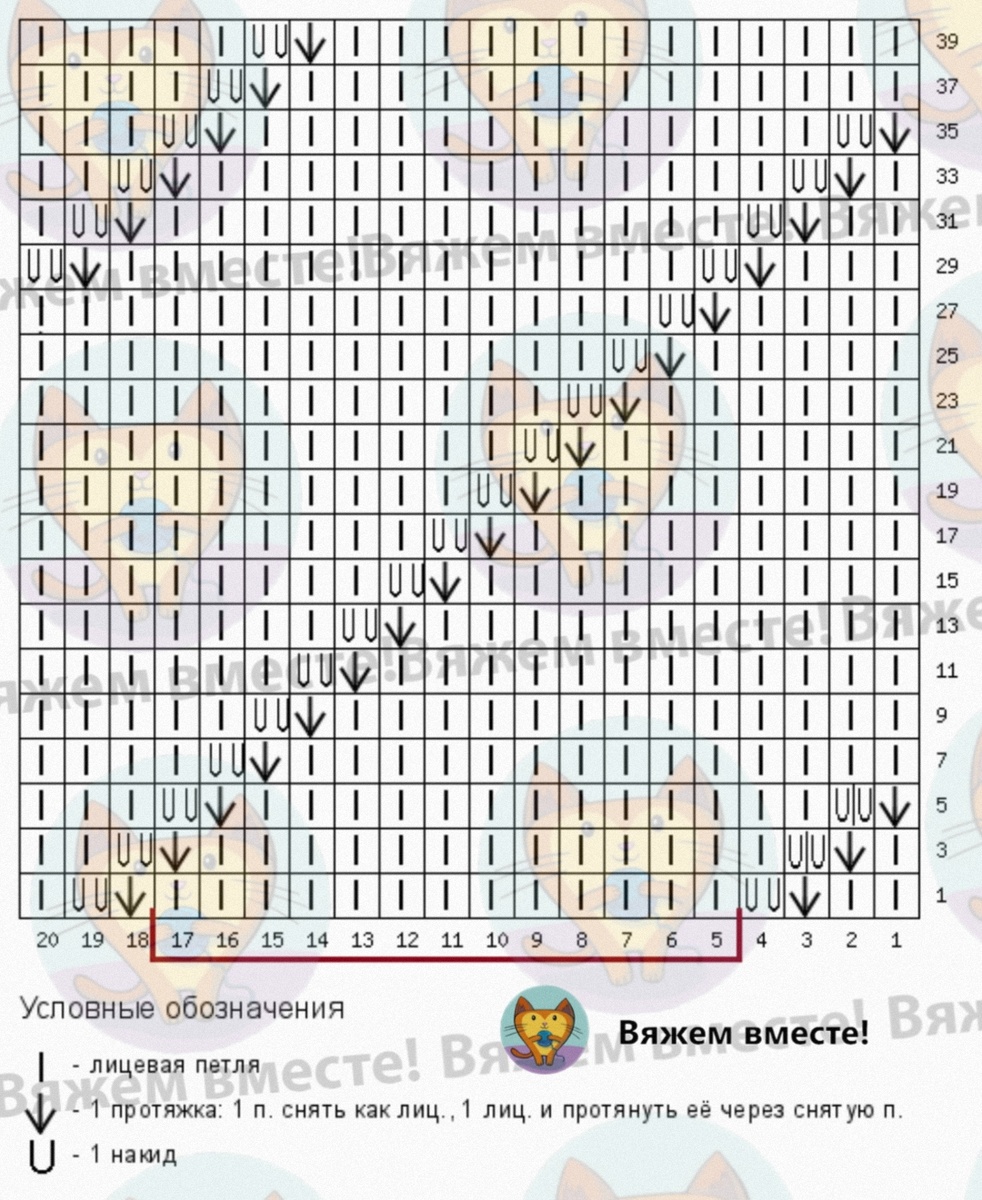Узор вяжется на базе лицевой глади. Накиды в узоре двойные, но из каждого двойного накида вывязывается только одна петля.