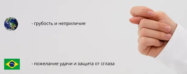 В большинстве стран мира это жест считается грубым и неприличным. Однако в Бразилии он используется как пожелание удачи и защиты от сглаза и используется как амулет против злых сил.