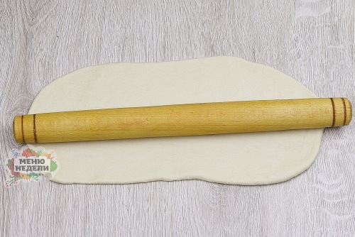 Раскатать в прямоугольный пласт. При необходимости, если тесто липнет, смазать руки маслом.