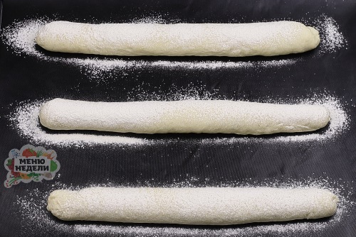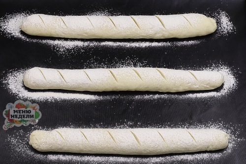 Противень застелить пергаментом или ковриком для выпечки. Расположить заготовки багетов на расстоянии друг от друга. Припылить сверху небольшим количеством муки.