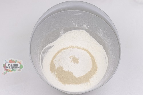К просеянной муке всыпать быстродействующие дрожжи. Перемешать ложкой до равномерного распределения по всей мучной массе.