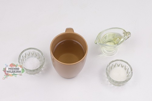 В чашку влить теплую воду. Температура воды должна быть 25-35 градусов. Это комфортная температура для работы дрожжей. Всыпать соль и сахар. Влить растительное масло. Использовать можно любое рафинированное. Можно заменить на растопленное сливочное масло. Перемешать, чтобы соль и сахар растворились.