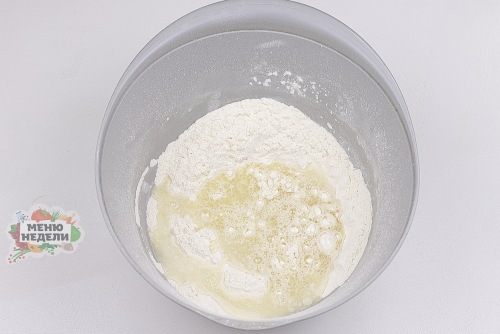 В центре мучной массы сделать небольшое углубление. Влить воду.