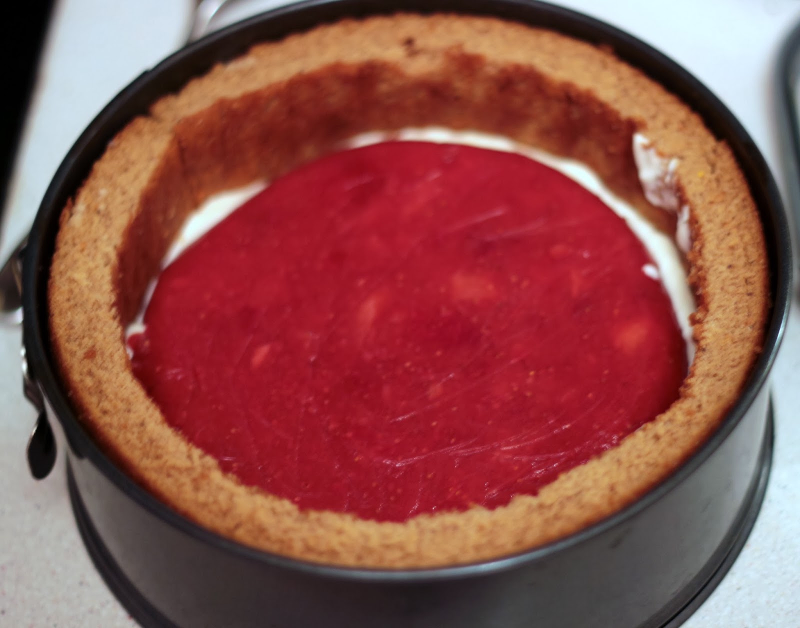 3. Пока бисквит остывает, приготовить клубничное желе. Замочить желатин в прохладной воде на 10 минут. Тем временем клубнику измельчить погружным блендером (я сделала довольно грубое пюре, чтобы попадались еще небольшие кусочки ягод). Клубничное пюре прогреть на водяной бане до температуры около 60 градусов, по желанию добавить сахар или мед (я добавила 1 ч.л. меда), ввести отжатый желатин и хорошо перемешать. Взять круглую форму, диаметром меньшим, чем форма для торта (чтобы круг клубничного желе поместился внутрь), застелить ее пищевой пленкой, оставляя свободные концы, и вылить пюре. Убрать в морозилку, меньше чем за час, оно схватится.