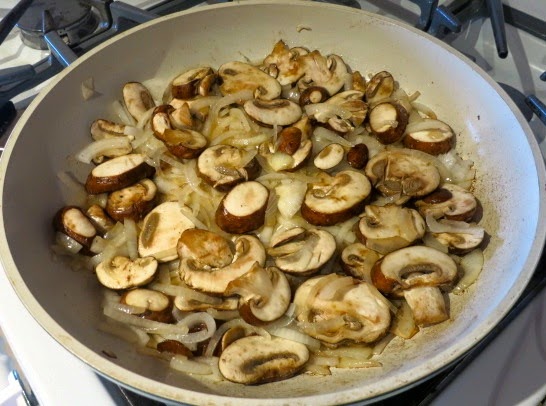 Лук режем тонкими четвертькольцами. Грибы режем тонкими ломтиками. Обжариваем грибы с луком на растительном масле на средне-большом огне, часто помешивая, минут 5, до золотистого цвета.