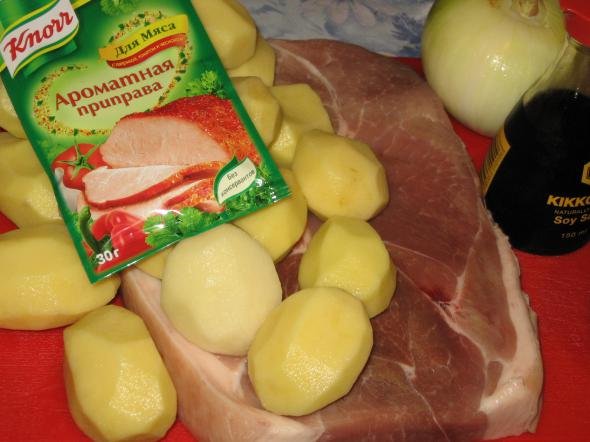 Для этого не понадобится много продуктов:свинина около килограмма, картошечка, лук, специи и никакого масла!
