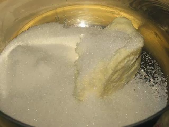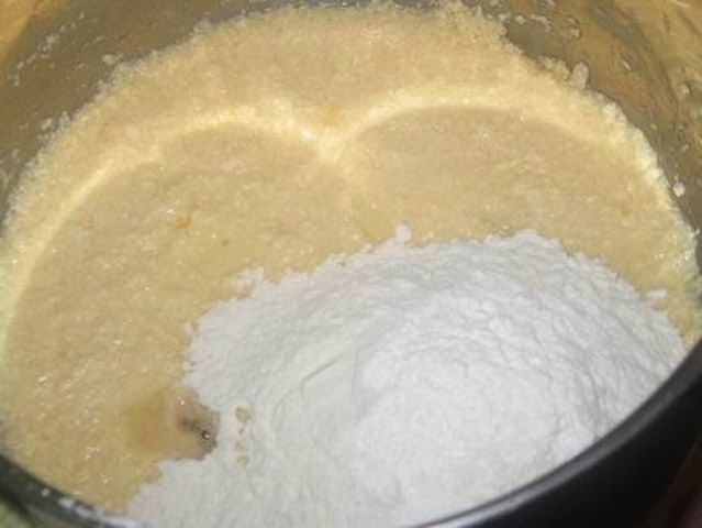 Потом по одному добавляем яйца, взбиваем. потом настала очередь муки, разрыхлителя и коньяка.