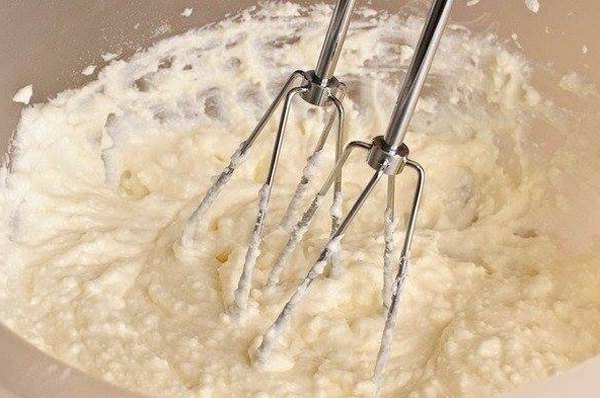 Шаг 3: В миске смешать венчиком до однородности творог и половину сахара. Убрать массу в холодильник.