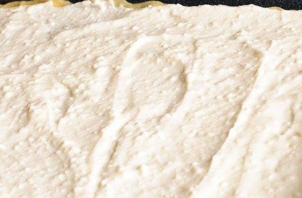 Шаг 5: Тесто из холодильника раскатать в пласт. Переложить его на лист для выпекания и сверху распределить творожную массу.