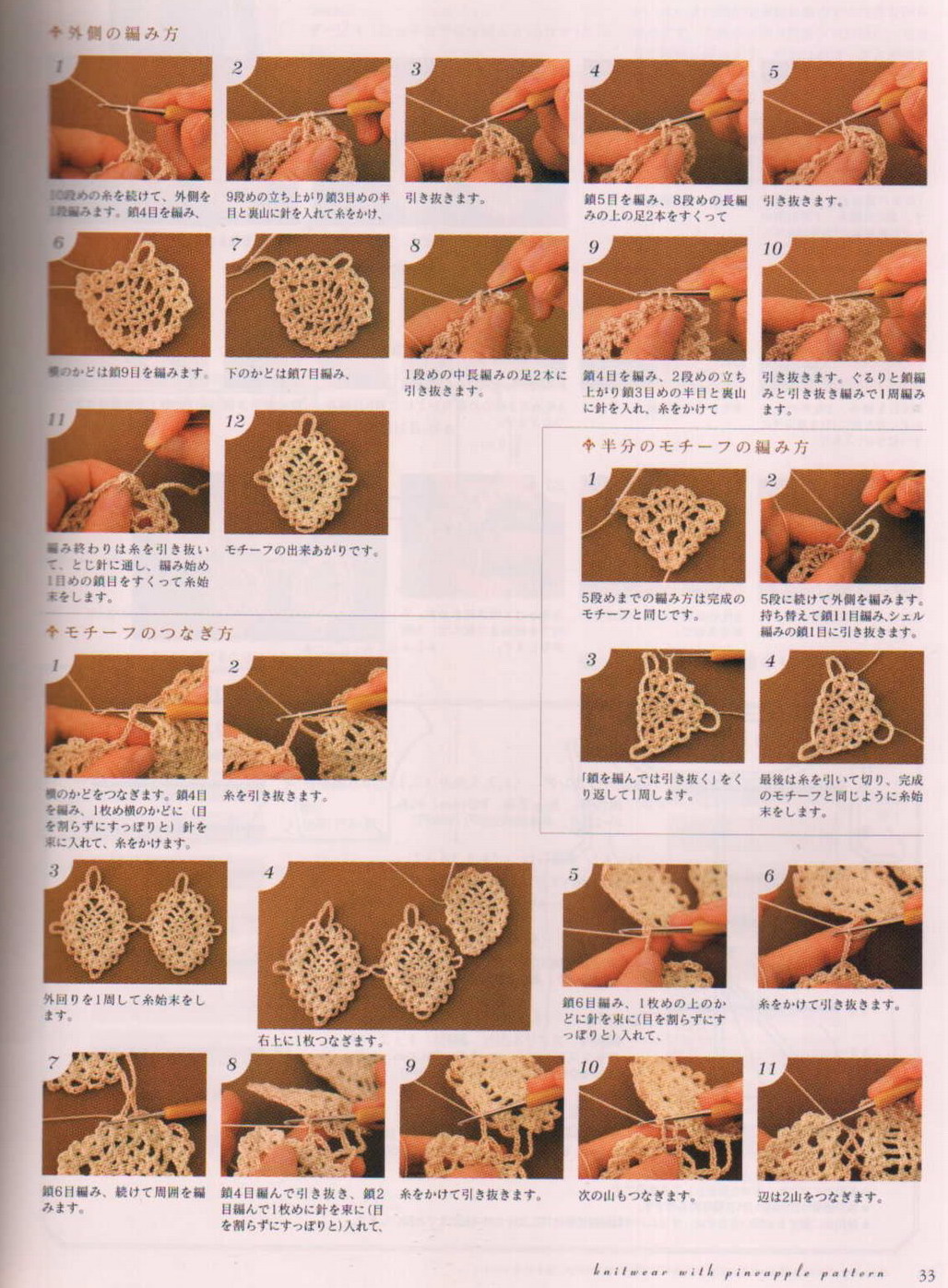 [показать]Здесь подробно в пошаговых фото показан процесс соединения отдельных "ананасных" мотивов в полотно