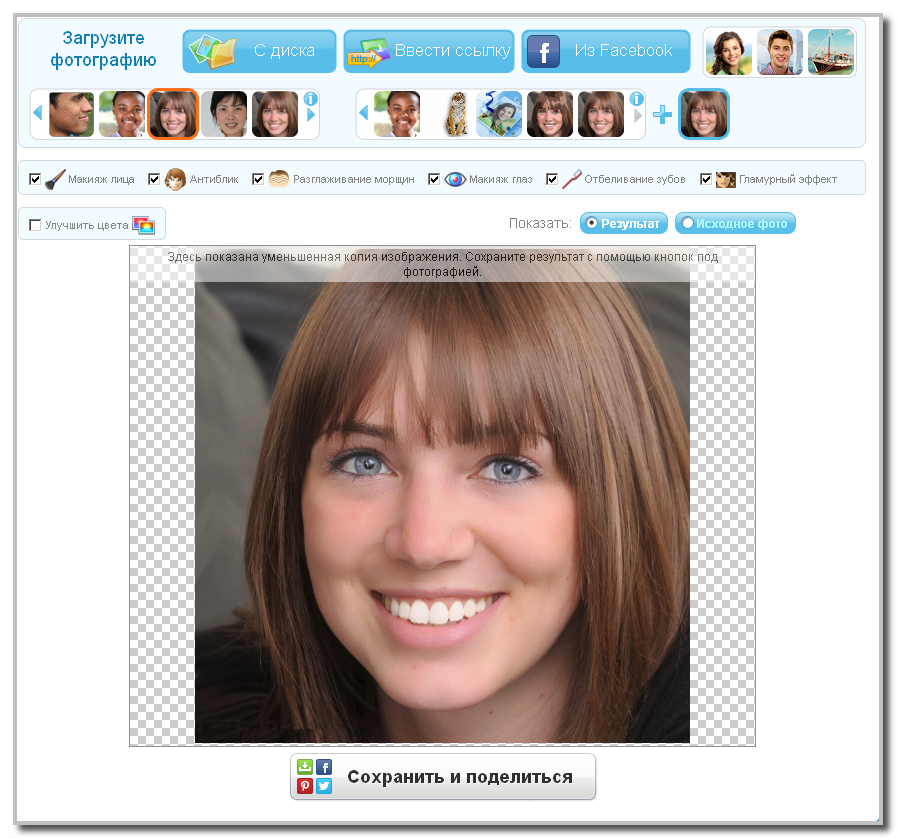 Здесь Вы можете сделать макияж лица, убрать блики, сделать разглаживание морщин и макияж глаз, сделать отбеливание зубов, применить гламурный эффект, а также улучшить цвета. Посмотрите на результат: