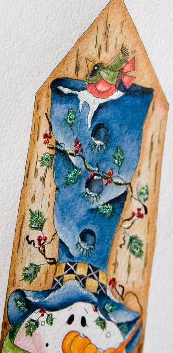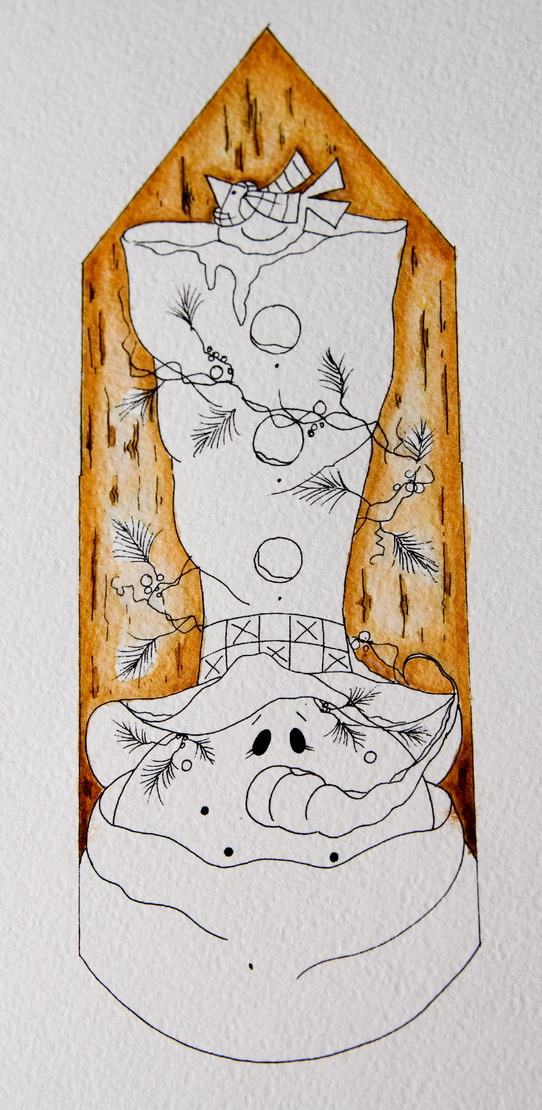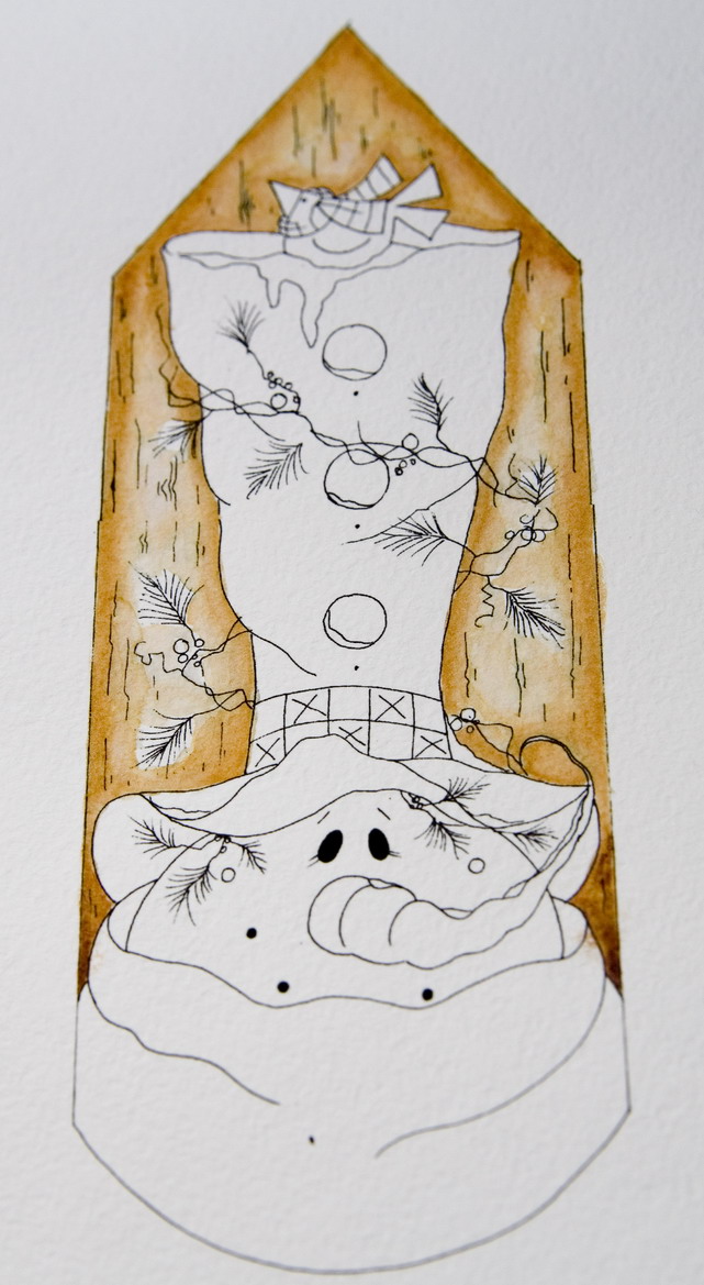 Далее красим шляпу снеговика. по той же методе, сначала закрашиваем её самым светлым тоном, хорошо разбавляя чернила водой.