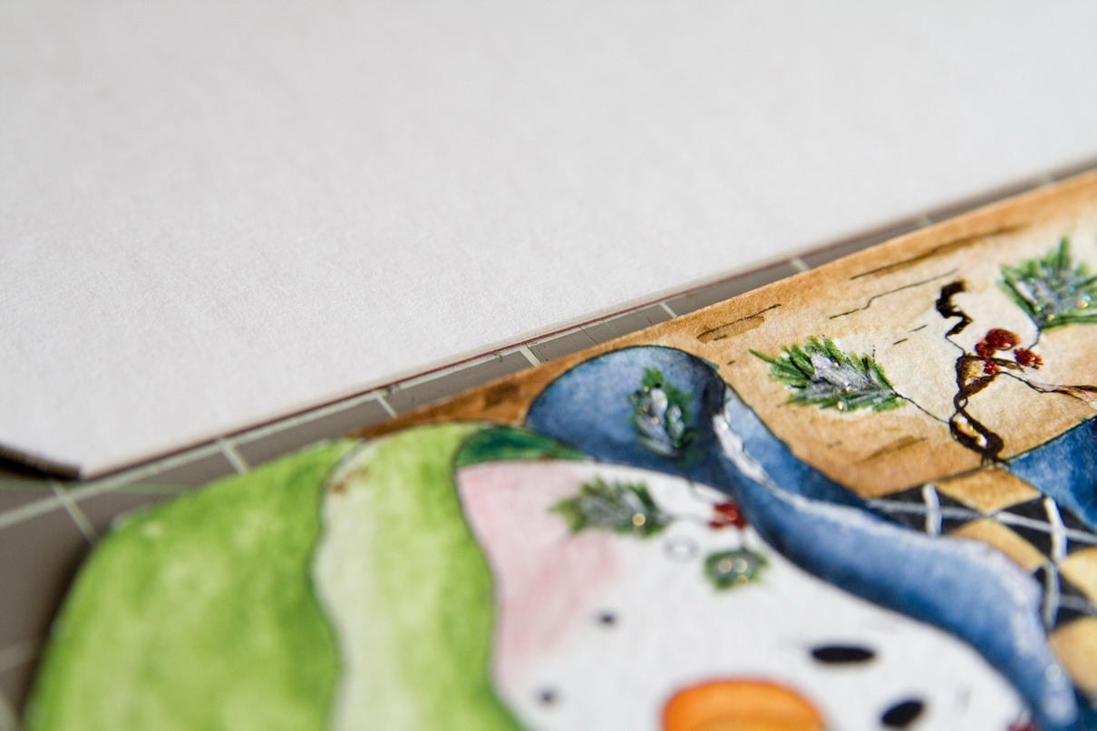 Теперь надо расскрасить хвою на веточках и красные ягодки. Их я просто расскрашиваю СУХИМИ акварельными карандашами, не размазывая их потом водой.