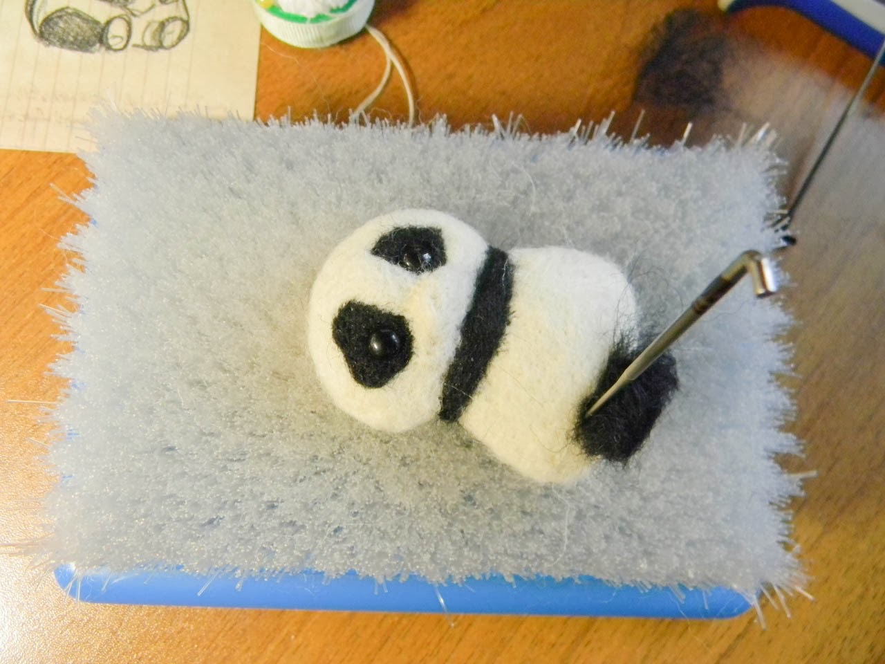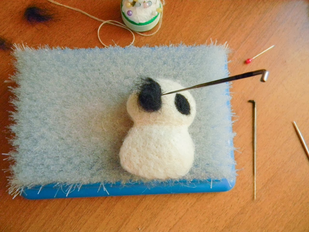 Тут у меня уже ушки на голове. Как я уже говорила, ушки я забыла включить в первоначальную основу, поэтому приваливала отдельно. Сначала я сделала сами ушки. Мохнатые кончики ушек я приваляла к обратной стороне мишки. Потом валяла в месте границы туловища и ушек, пытаясь завести волокна ушек в основную форму, а волокна формы - в ушки. Тут не вставляем иголку слишком глубоко, иначе наши черные волокна могу вылезти из мордахи панды =)