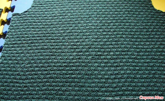 По лицевой стороне, начиная от бокового шва правой полочки, набрать и провязать лицевой по 1 петле на каждой петле наборных петель вниз до самой нижнего уголка, по 1 петле на каждой петле первоначального наборного ряда, по 2 петли на каждые 3 ряда восходящей стороны уголка, по 3 петли на каждые 4 ряда вдоль края правой полочки, набрать по 1-й петле на каждой закрытой петле вдоль выреза горловины спинки, по 3 петли на каждые 4 ряда вдоль края левой полочки, по 2 петли на каждые 3 ряда нисходящей стороны уголка, по 1 петле на каждой петле первоначального наборного ряда, по 1 петле на каждой петле наборных петель верх до бокового шва. В заключение набрать по 1 петле на каждую петлю наборного ряда спинки. Соединить петли в круговой ряд.