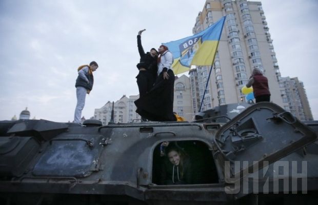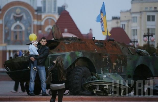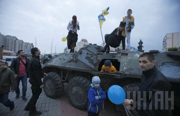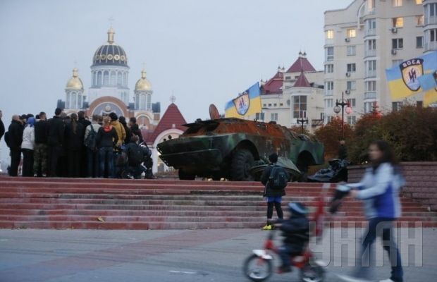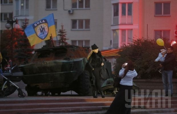 Батальон специального назначения "Азов" в Оболонском районе Киева показал технику, отбитую у российских военных во время войны на Донбассе.
