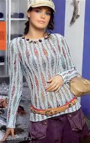 Пуловер из мягкой пряжи выполнен спицами изысканным узором из кос с отверстиями, создающими приятную прохладу на теле.