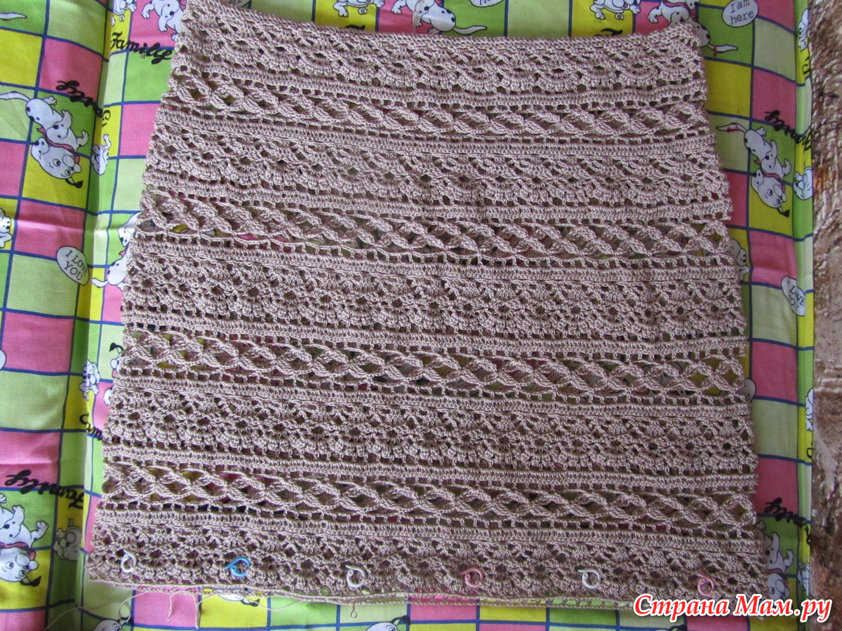 Длина юбки в данный момент составляет 43 см. Начинаю делать равномерно прибавки в конце каждого узора.