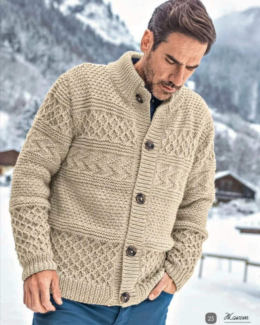 Шикарная мужская кофта с воротником-стойкой произвела впечатление. Довольно толстая пряжа (80 м/50 г) плюс чередование простых, но эффектных узоров обещают процесс быстрый и увлекательный.