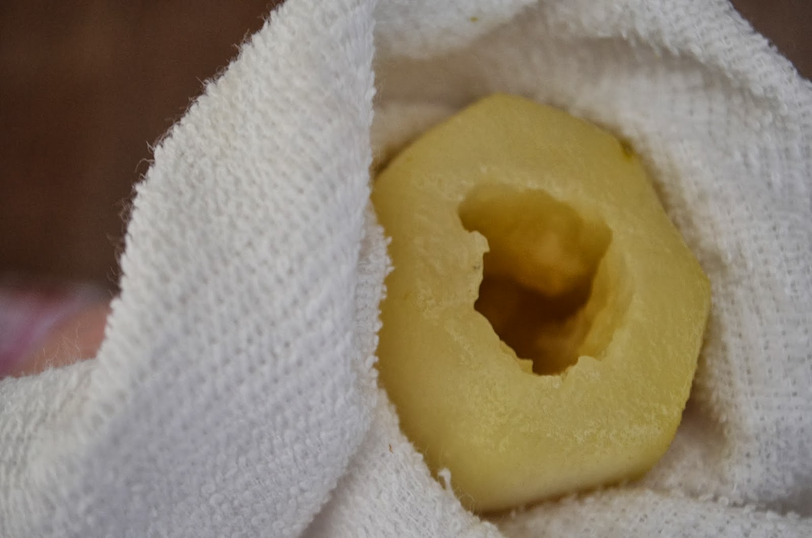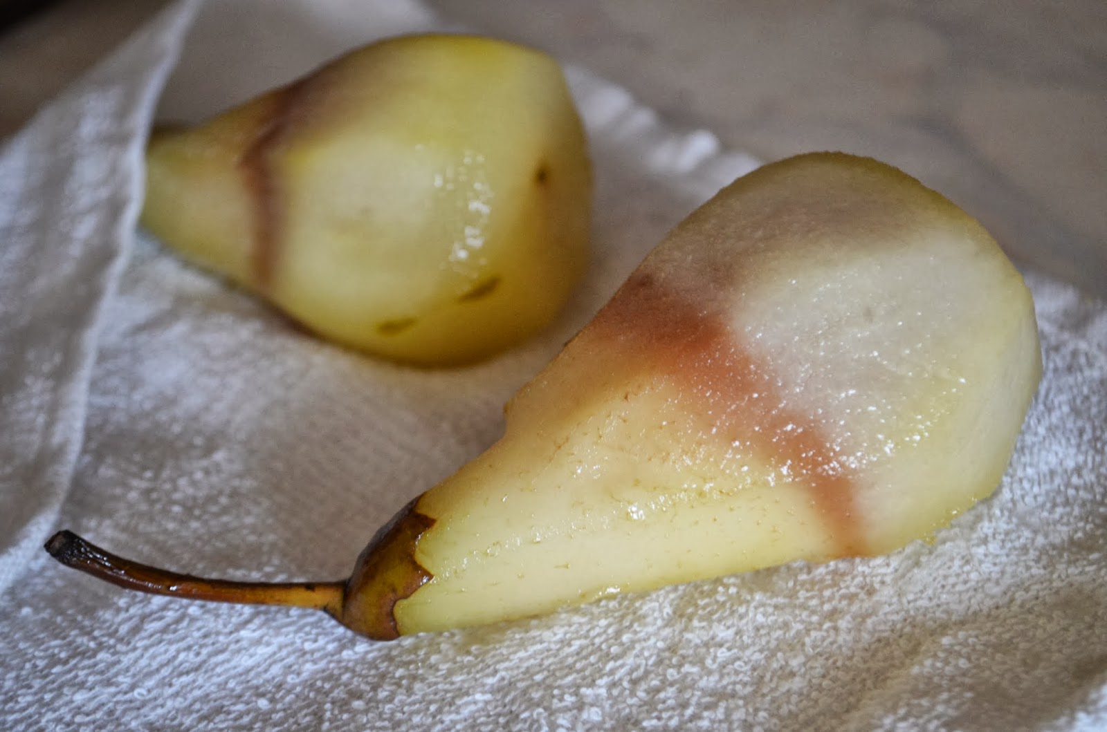 Достать остывшие груши, обсушить их полотенцем и специальным ножом для чистки фруктов удалить серединку.
