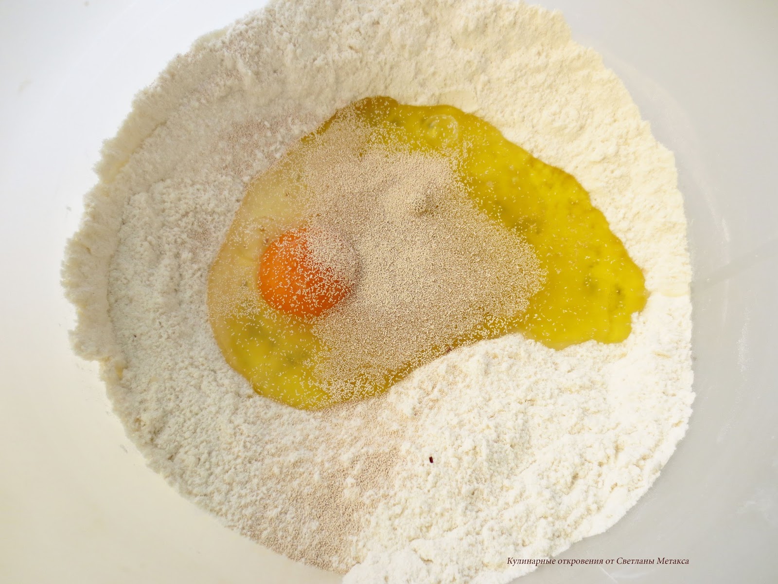 Сделать в середине углубление и добавить масло, яйцо, дрожжи. В оригинале рецепта яйцо не добавляют.