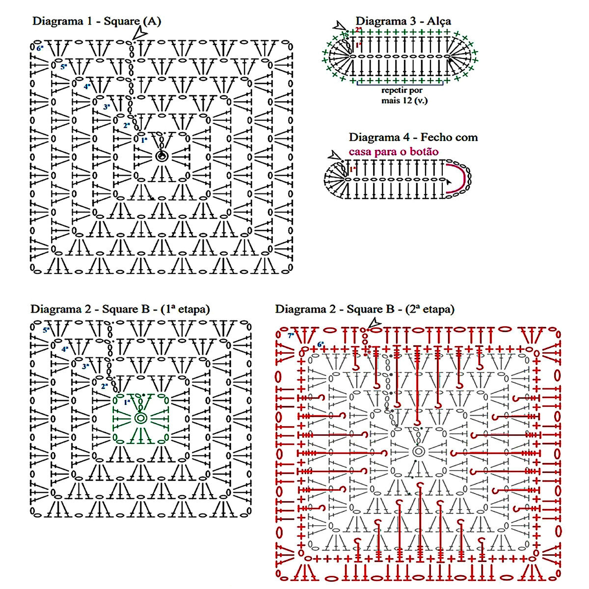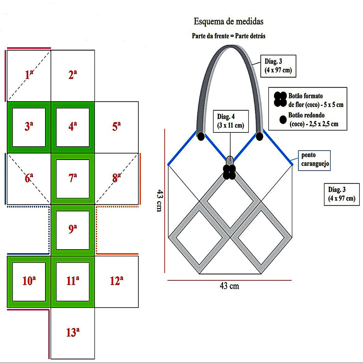 Для вязания нам понадобится около 4 мотков серой пряжи и 3 мотков салатово-зелёной пряжи — 100% мерсеризованный хлопок; 100 гр — 130 м. Крючок № 3,5-4. Одна большая пуговица для центральной застёжки и 4 пуговицы для ручек. Средний размер одного квадрата — 15 х 15 см.