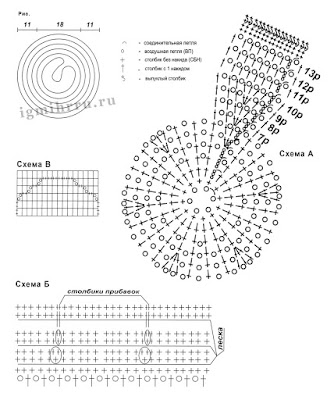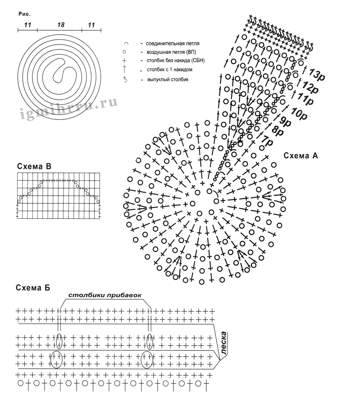 Пересчитайте их и разделите на 11. Это периодичность прибавок. Она может не соответствовать указанной на схеме, так как зависит от пряжи и индивидуальной плотности вязания. В схеме Б места прибавок отмечены овалом. Отогните леску на изнаночную сторону полей и провяжите ряд без лески, выполняя прибавки. Дойдя до конца ряда, приложите леску и провяжите ряд ст. б/н без прибавок.