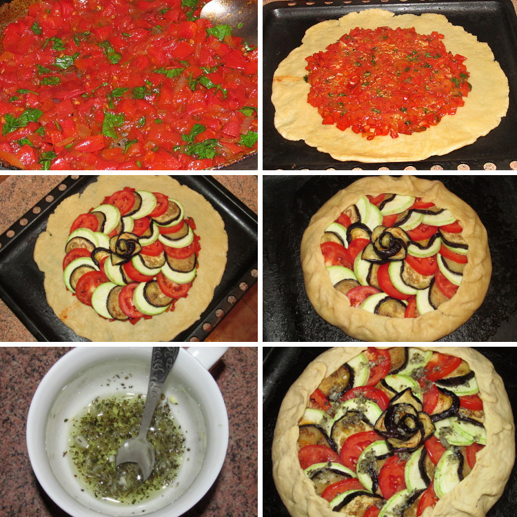 На соус по кругу чередуя выложить кружочки баклажана, кабачка и помидора.