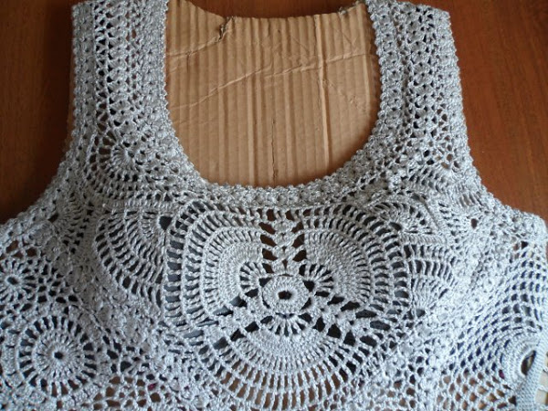 Костюм состоит из кардигана, связанного спицами, и платья, связанного крючком