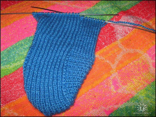Провязав до края, по бокам набрала по 9 петель. Бока вязала лицевой гладью, свободно. Примеряя слегка натягивайте, а то при носке следки расстягиваются . По лицевой стороне по бокам оставила по 9 петель , а те что в середине провязала по 2 петли вместе . С изнаночной стороны начала вязать пятку.
