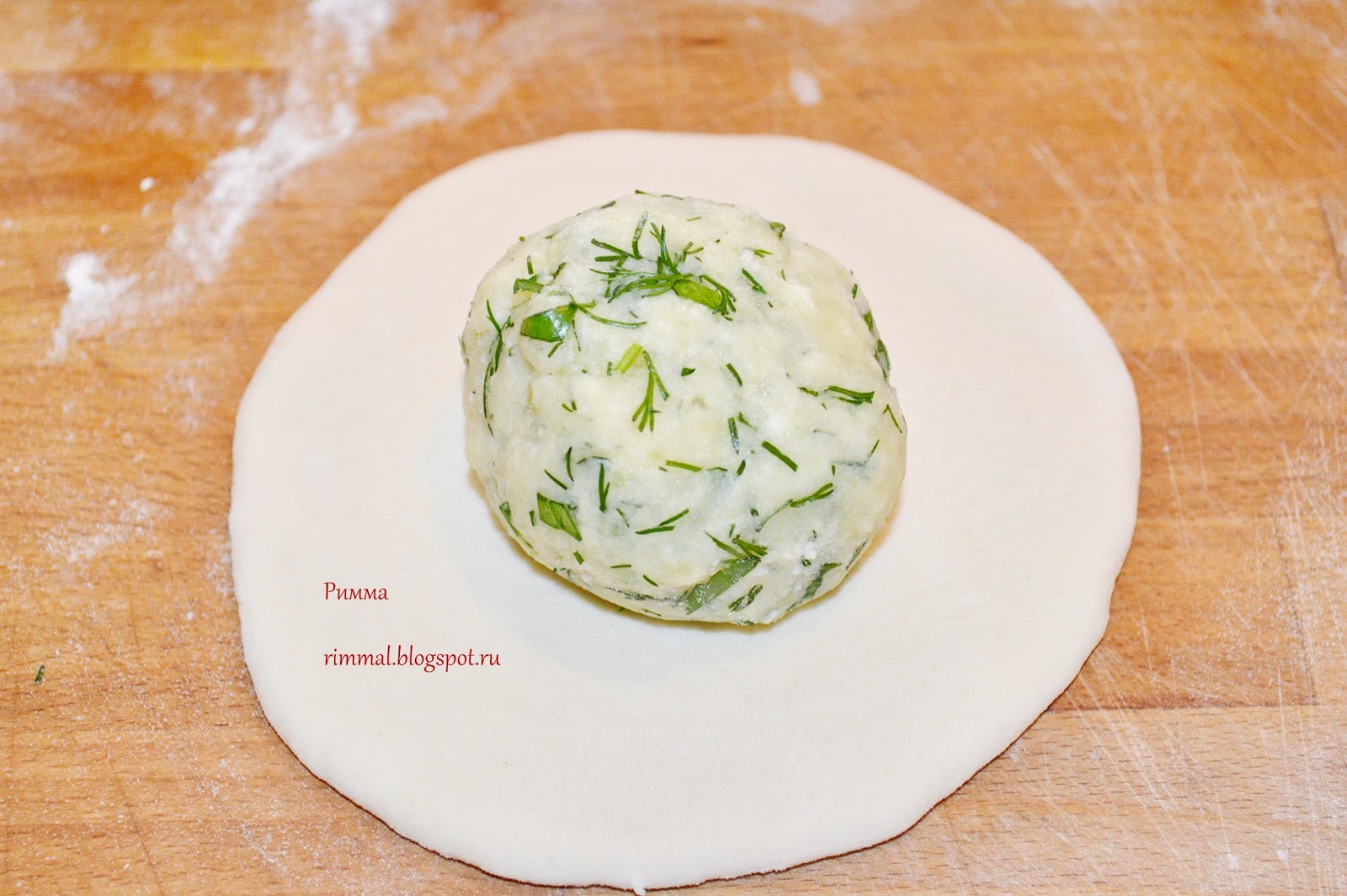 Каждую часть теста раскатайте в маленькую лепешку, так, чтобы в нее можно было завернуть наш колобок из начинки.