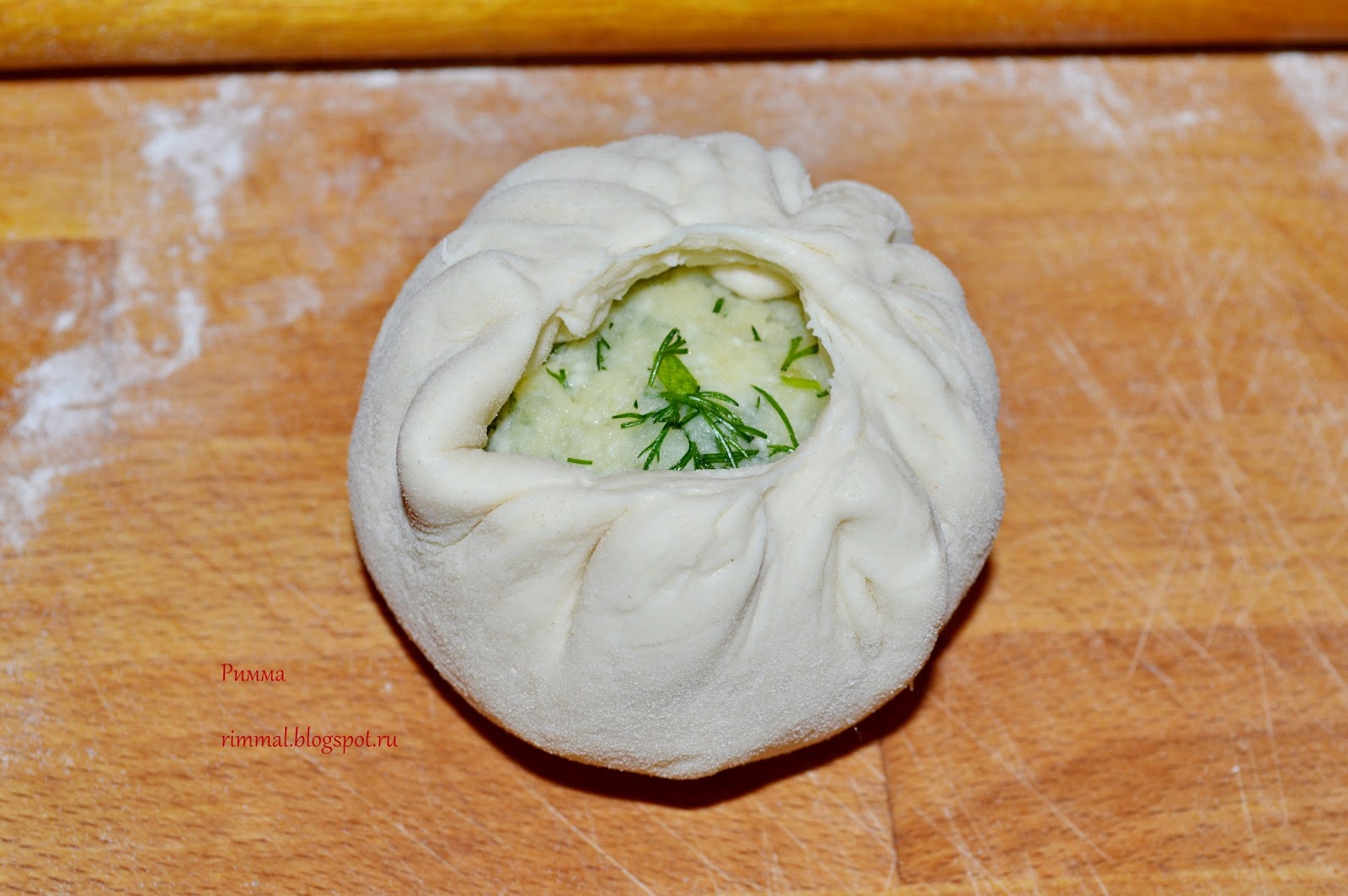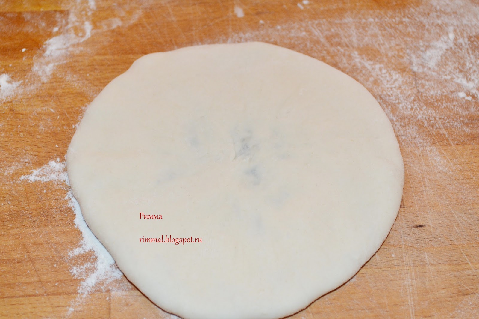 Соберите все края теста, защипите и присыпьте немного мукой, чтобы лепешка при раскатывании не липла с разделочной доске.