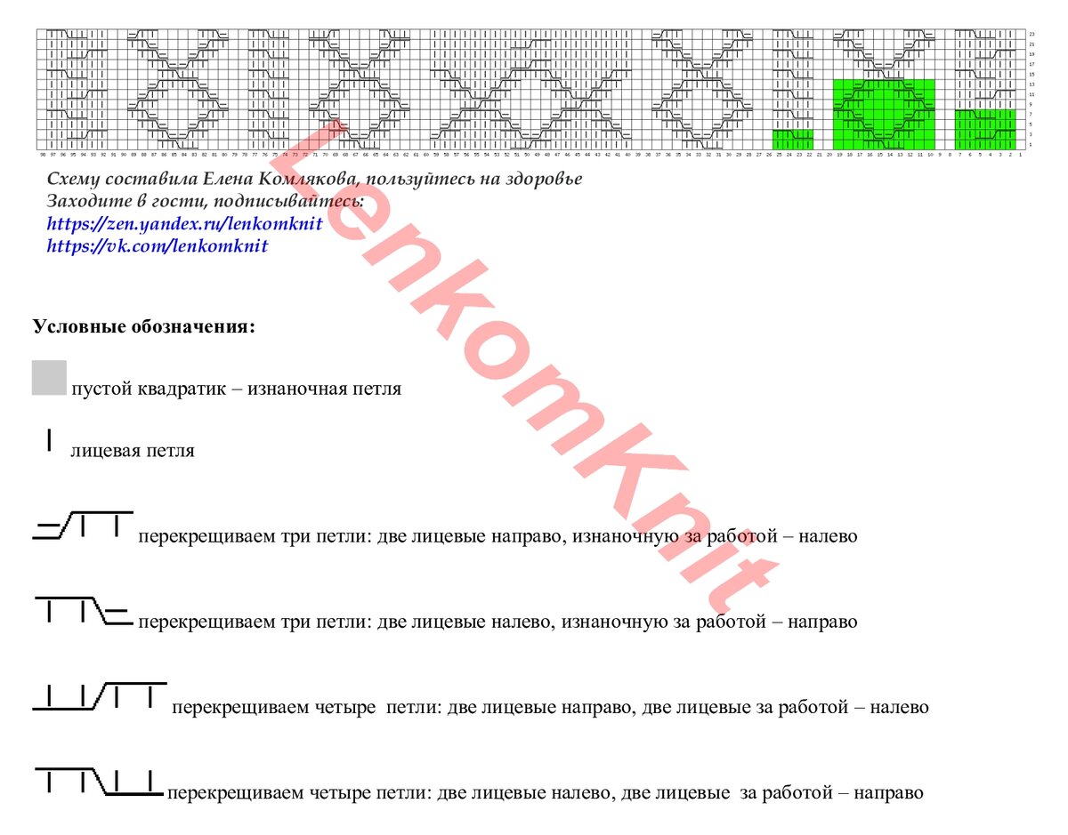 На рисунке – схема узора с условными обозначениями. Центральный узор – раппорт нарисован в высоту и ширину полностью. Для остальных узоров раппорт выделен контрастным цветом.