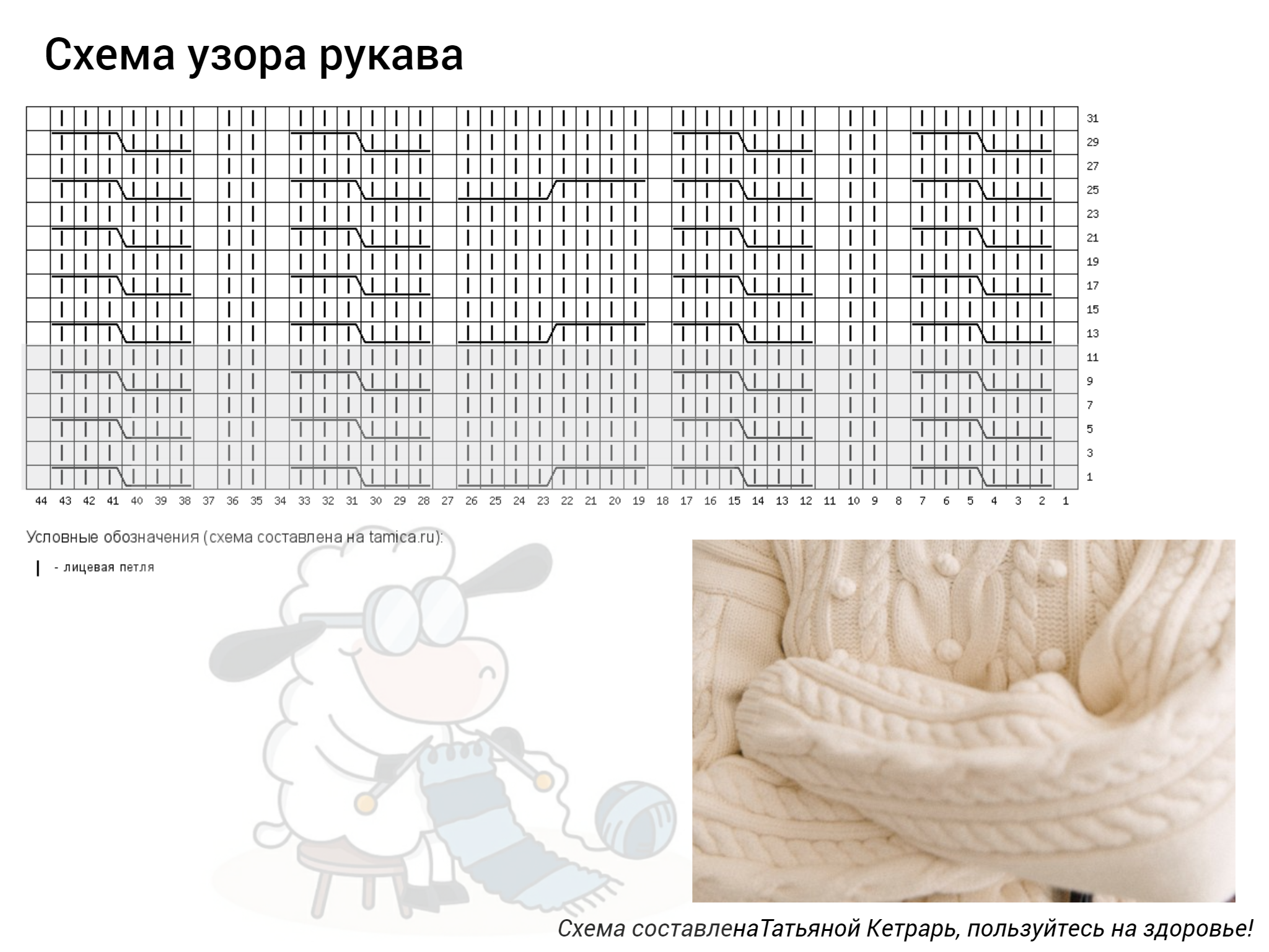 На схеме: оригинальный узор центральной части рукава с перекручиваниями в одну сторону.