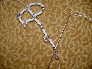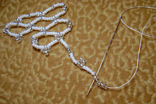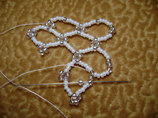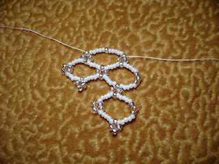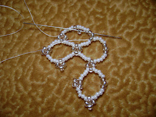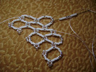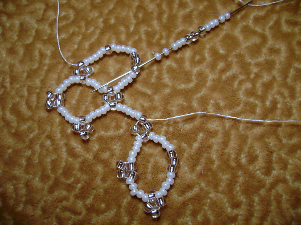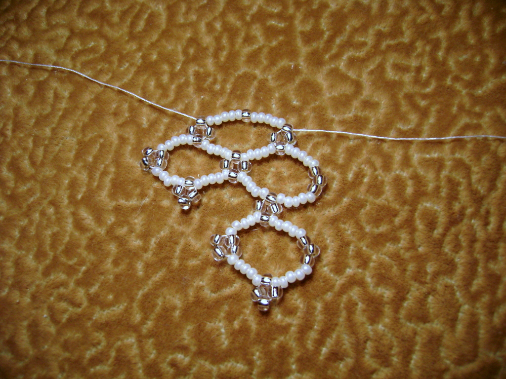 Нанизываем 1 прозрачную бисерину и проходим в верхнюю прозрачную бисерину из трёх сверху вниз. И так далее...