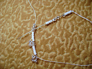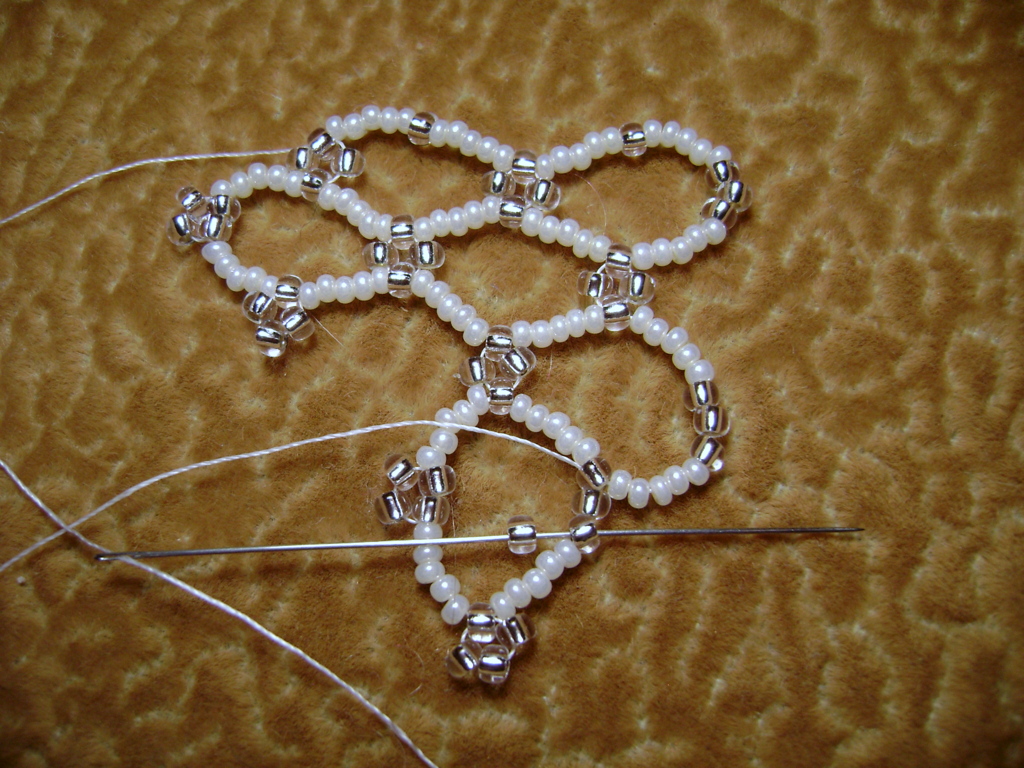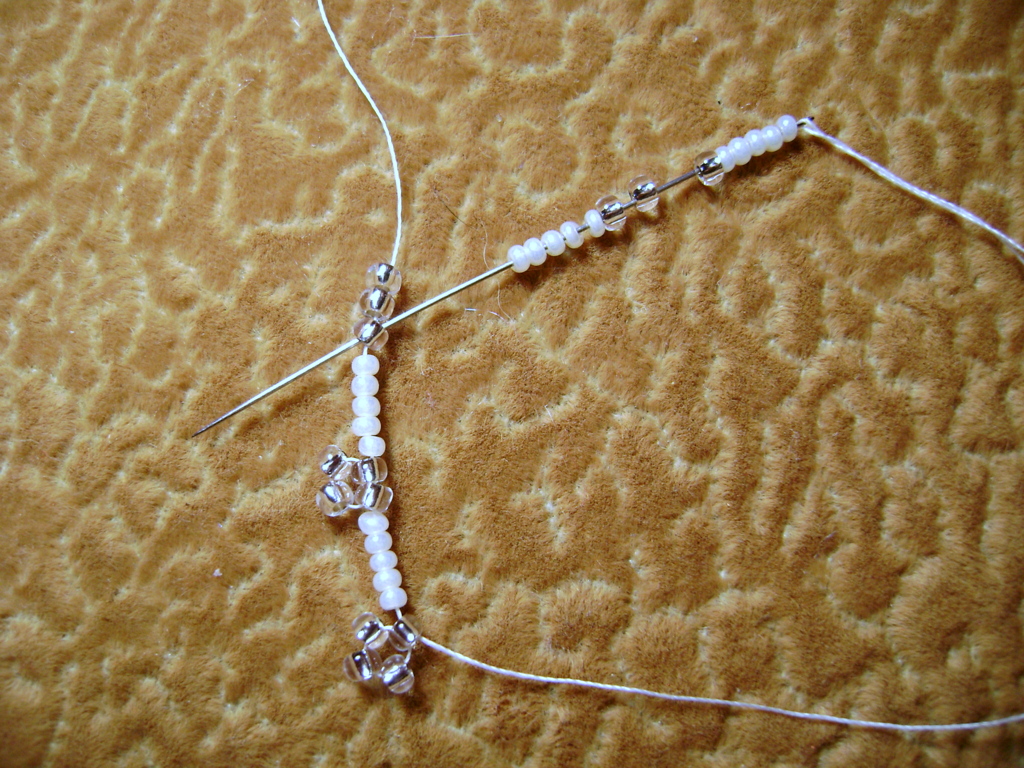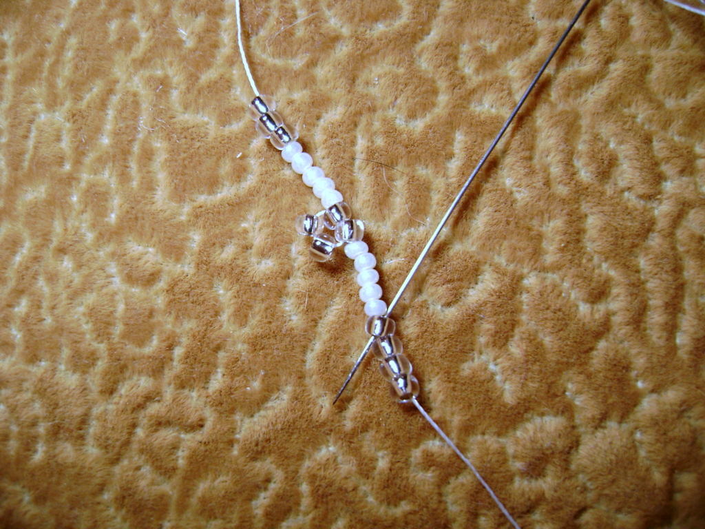 Нанизываем 5 бежевых, 3 прозрачных, 5 бежевых бисерин. Проходим иглой в нижнюю прозрачную бисерину из той троицы, что не замкнута в колечко или крестик. Иглой проходим сверху вниз.