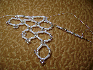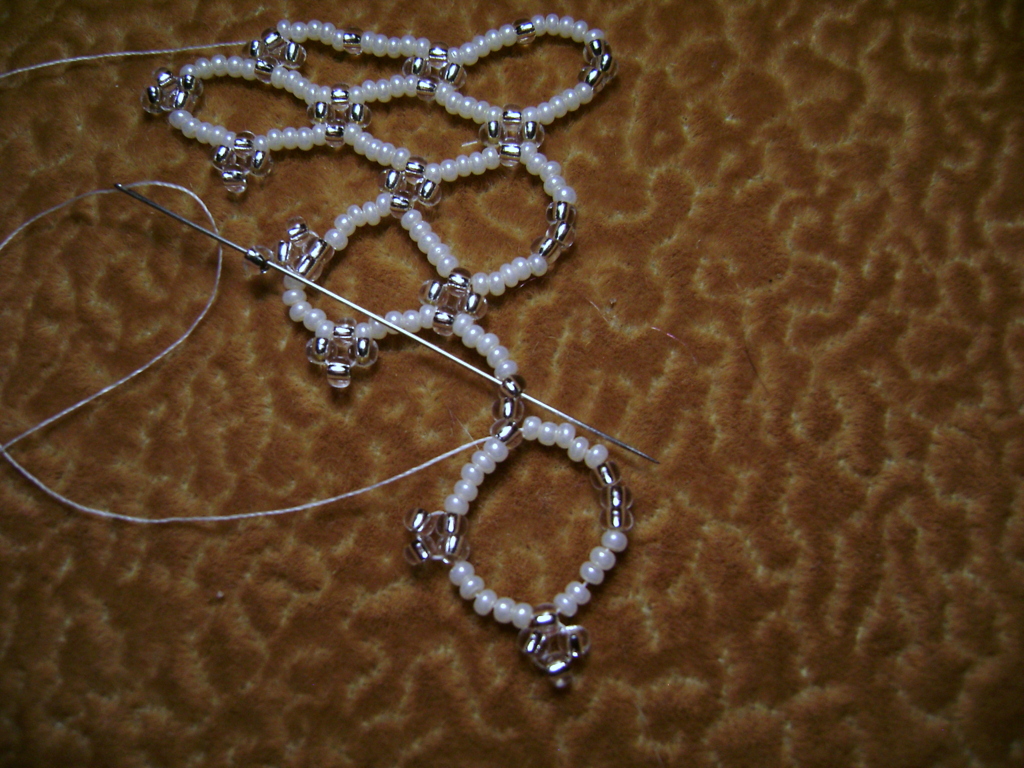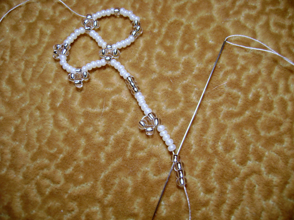 Нанизываем еще 5 бежевых, 3 прозрачных, 5 бежевых бисерин и входим иглой в нижнюю из трех прозрачных бисерин сверху вниз, как это показано на фото.