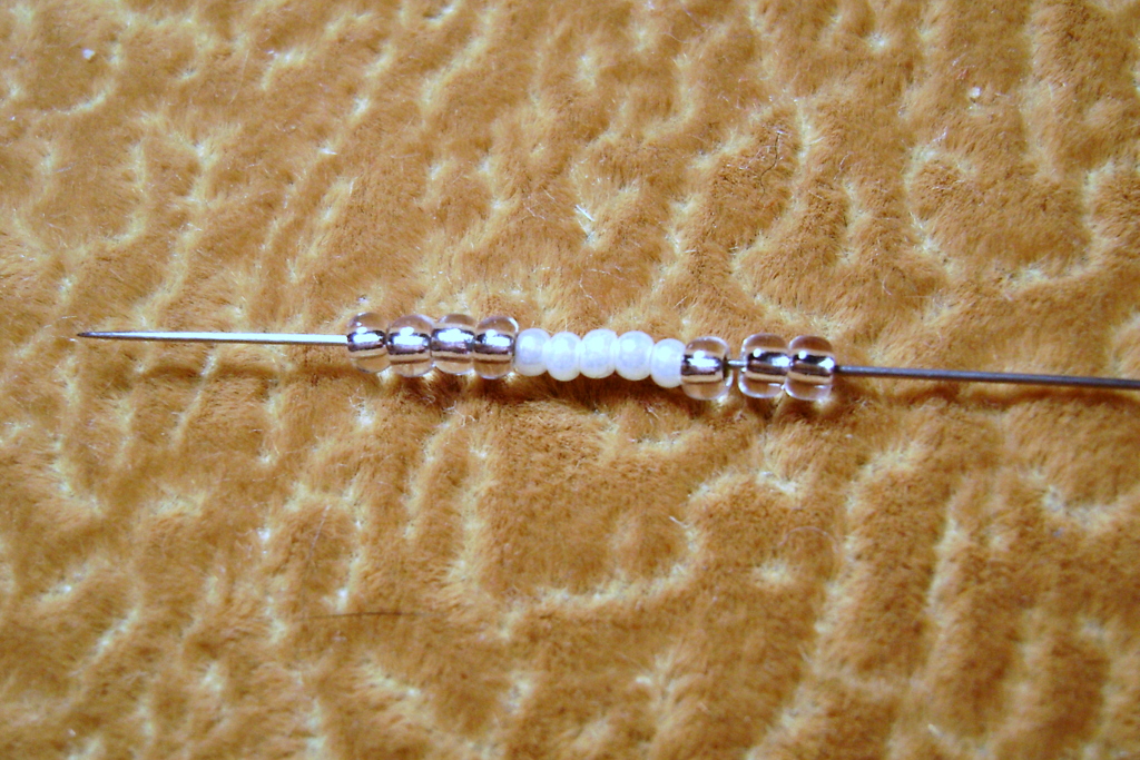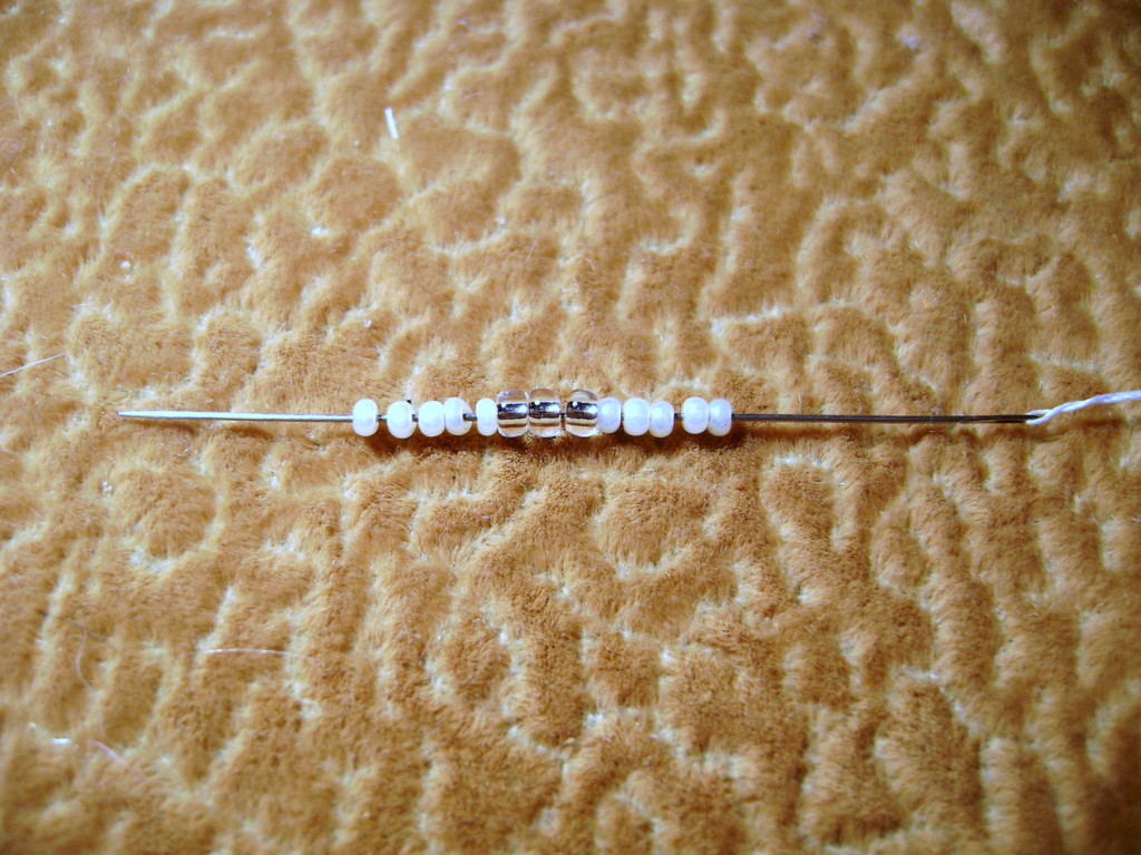 Набираем 5 бежевых бисерин, 3 прозрачных, 5 бежевых.