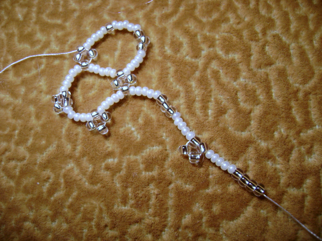И снова нанизываем 5 бежевых, 1 прозрачную, 5 бежевых, 3 прозрачных, 5 бежевых бисерин. Проходим иглой в верхнюю прозрачную бисерину из трех снизу вверх, как это показано на фото.