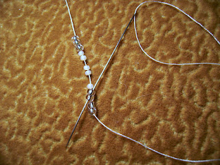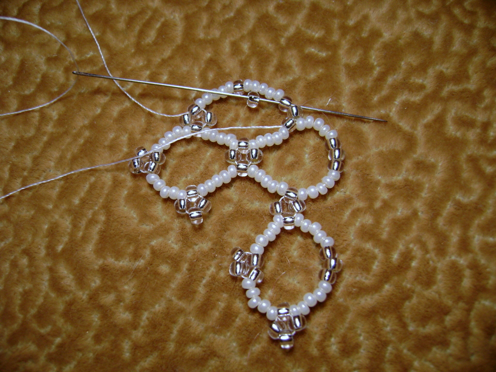 Проходим иглой в верхнюю из трех прозрачных бисерин снизу вверх, как это показано на фото.