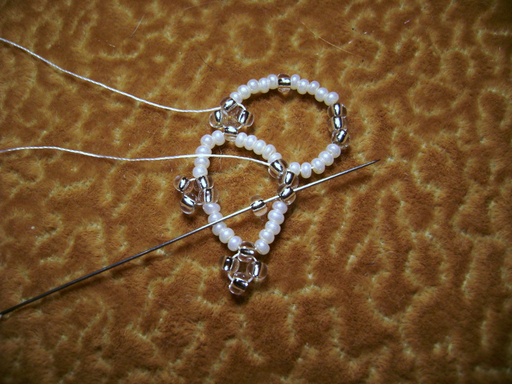 Проходим иглой в две из последних четырех набранных прозрачных бисерин сверху вниз, замыкая круг.