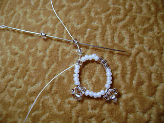 И проходим иглой в одну из четырех только что набранных прозрачных бисерин, замыкая кольцо.