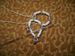 Подтягиваем нить, получаем такое вот кольцо пока непонятное :) Нанизываем на иголку одну прозрачную бисерину и проходим ею в самую первую прозрачную бисерину (опять же, сверху вниз, а не снизу вверх, это очень принципиальный вопрос в данном плетении).