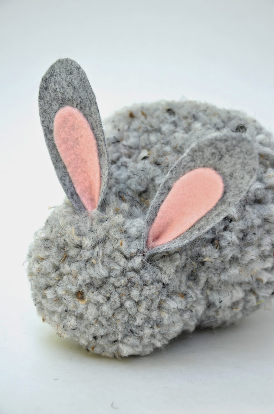 Вот как мы сделали наших кроликов. Мы использовали самую толстую пряжу . Толстая пряжа лучше для помпонов, потому что она заполняют формы быстро, что особенно важно, когда вы находитесь в серийном производстве .