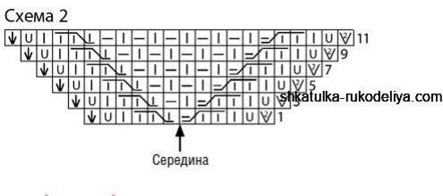 Внимание! С обеих сторон между подчеркнутыми убавками и узором кокетки сокращаются участки лицевой гладью.